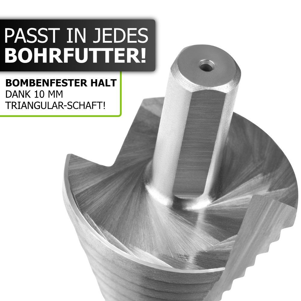 Mit dem Pinava Stufenbohrer bohren Sie saubere & kreisrunde Löcher in Blech, Holz oder Kunststoffe. Der speziell hergestellte Triangular-Schaft mit einem Durchmesser von 10mm passt in jedes Bohrfutter!