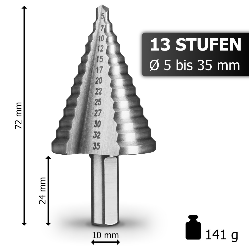 Beim Bohren von großen Bohrlöchern in Metallen, Kunststoffen oder Holz hat man das Problem, dass man ohne Stufenbohrer Schritt für Schritt einen immer größeren Bohrer benötigt. Das kostet nicht nur Geld, sondern ist auch extrem langwierig. Somal ein Bohrer mit 35mm Durchmesser nicht immer leicht zu finden ist. Ein Stufenbohrer ist für viele Materialien einsetzbar und bietet 13 verschiedene Durchmesser vereint in einem Bohrer. Mit der scharfen selbstzentrierenden Spitze des Stufenbohrers lassen sich somit große Löcher ohne Vorbohren bohren. Große Bohrdurchmesser sind somit möglich und ein lästiger Bohrerwechsel entfällt.